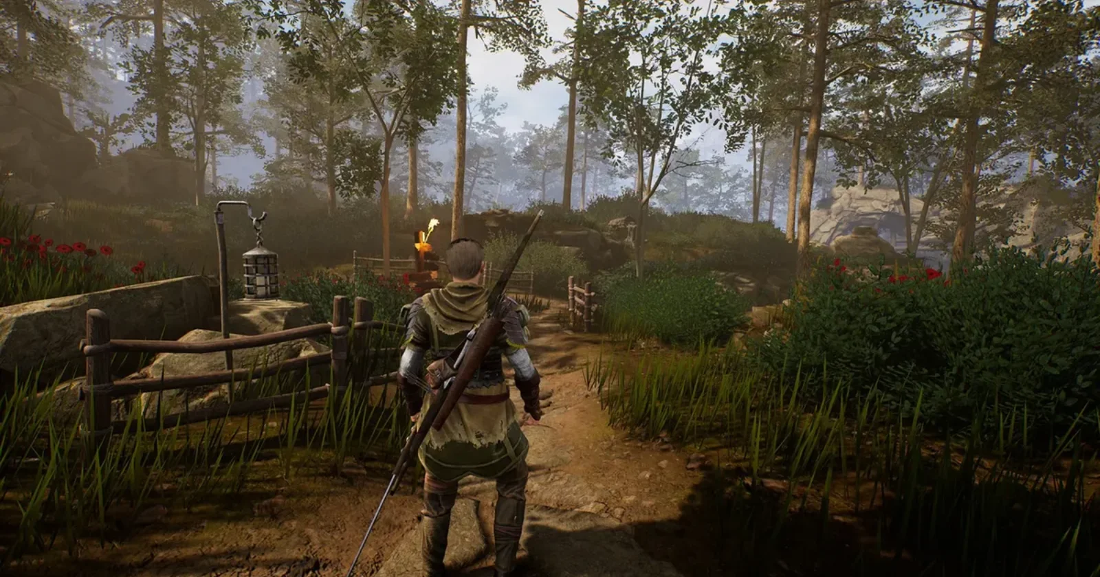 - Пройдите к частоколу и следуйте по узкой тропинке на склоне холма. За этим местом вы увидите большую базу с деревянными стенами и башнями. В этой местности много врагов — людей и животных, поэтому просто избегайте их, пока не доберетесь до базы Свободных Охотников.